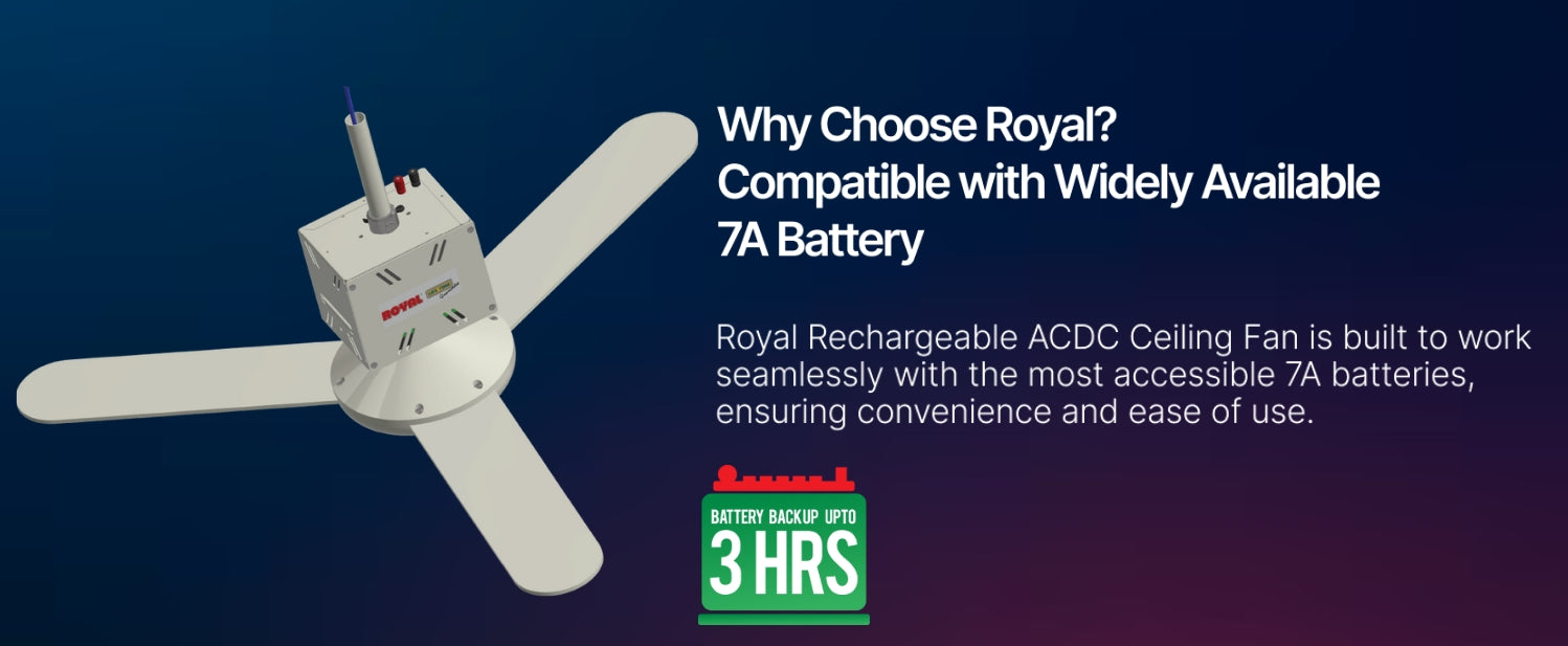 The Royal Battery ceiling fan is designed to operate using standard 7-ampere-hour dry batteries, which are commonly available in many stores.